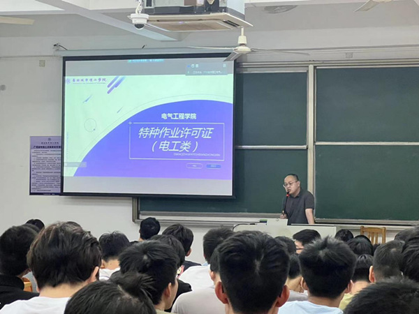 会上,吴钟桁为同学们介绍了近年来市面上常见电工证的调整变化,其中特别指出电工进网作业许可证如今已由特种作业操作证(电工)替代,并点明其“三年一审、六年一换”的有效期限。其还特别强调,特种作业操作证(电工)是当前电力行业求职竞争力的重要体现。随后,其介绍了特种作业许可证(电工类)的报名方式,鼓励同学们积极报名。会议最后,吴钟桁耐心地为同学们解疑答惑。整个会议过程中,吴钟桁老师的讲解幽默风趣,同学们在轻松活跃的氛围中了解到特种作业操作证(电工类)对于个人就业的重要性。