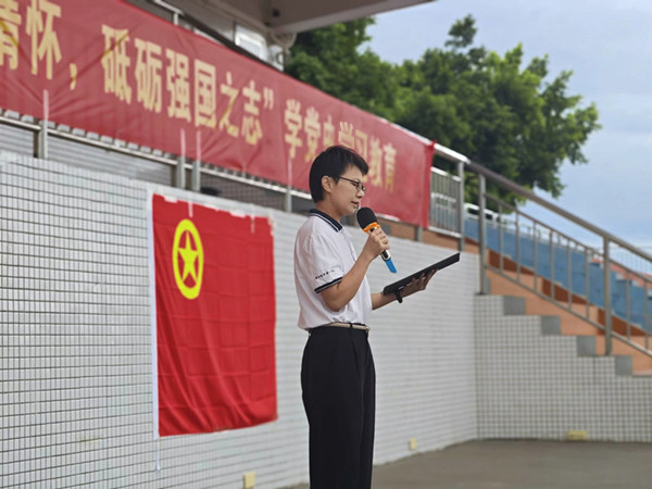 伴随着国旗护卫队铿锵有力的“齐步走!”和整齐划一的步伐,升旗仪式正式拉开帷幕。全体师生向国旗行注目礼,五星红旗在庄严的国歌声中徐徐升起。礼毕,符红勋发表讲话。她带领同学们简要回顾了中国共产党从无到有、不断发展壮大的历程,鼓励同学们要将爱党、爱国情怀内化于心、外化于行,刻苦学习、提升自我,以充足的知识储备和饱满的精神状态追求梦想,迎接新时代。