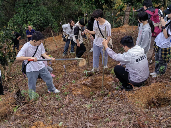 南粤春来早,植树添绿正当时。活动当天,团委、员工会的成员手持锄头、水桶等工具,积极投入到义务植树的行列中。选址、打穴、将树根全部埋入到树坑之中,盖上土踩实,再浇上满满一桶水,最后为树苗挂上手写的牌子,大家分工合作,有序进行植树工作。同学们不仅埋下了一颗颗新苗,还学习到了植树的技巧和养护方法。春光明媚,微风轻拂,山坡上欢声笑语不断。尽管汗水浸湿了衣衫,但是大家在实践中感受到了种树的乐趣。薛梓杰同学表示:“这场义务植树活动让我感受到了大自然的力量和美丽,同时也让我更加明白了保护环境的重要性,以后我会更加珍惜资源,积极参与绿美广东建设行动。”